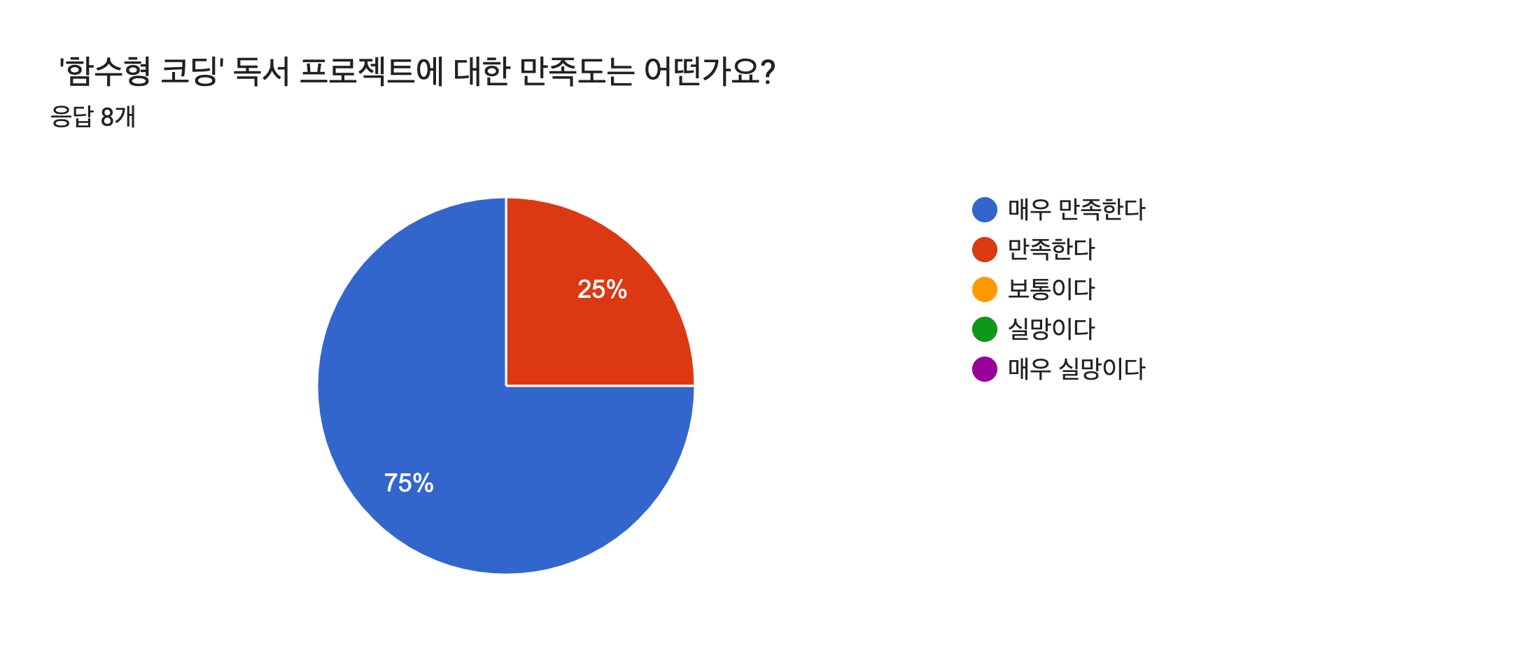 1차 학습 프로젝트를 끝내고 나서 실시한 설문 조사를 실시한 결과입니다. 감사하게도 모든 참가자들이 '스터디 캠프'의 '함수형 프로그래밍' 스터디 과정을 만족하고 계셨습니다.