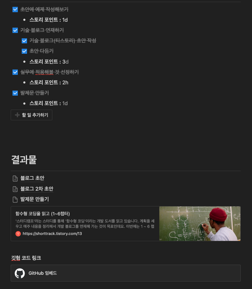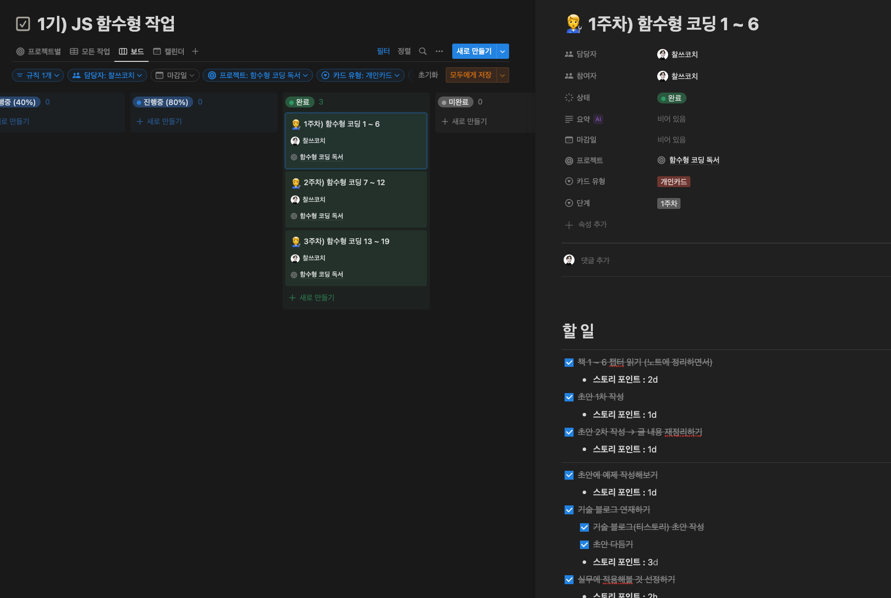 스샷에서 보듯이 매주 각자의 작업카드가 주어지고, 1주 동안 자신이 수행할 학습 계획을 세웁니다. 진행상황을 계속적으로 업데이트 해가구요. 자신이 공부한 내용에 대해 블로그 초안을 작성 하였습니다.