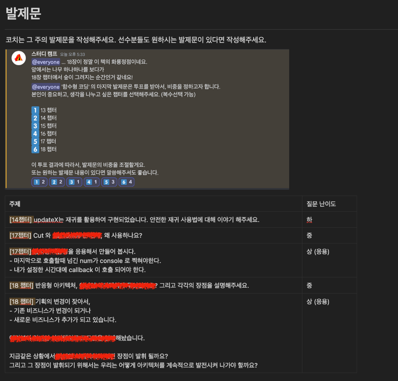 특히 매주 '최종미팅' 에서는 코치가 아래와 같이 발제문을 미리 준비하고요. 주제에 맞게