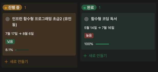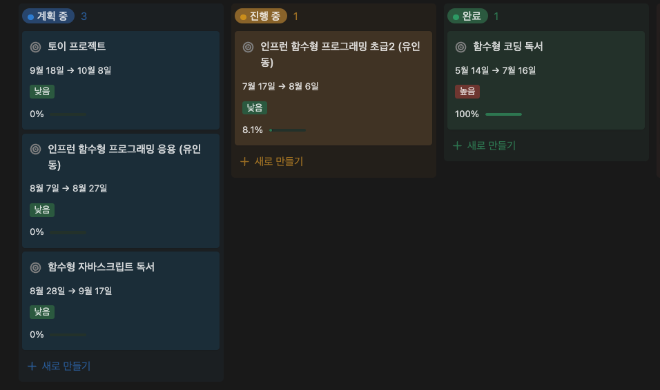 벌써 3주 만에 두꺼운 기술서적 한 권 (쏙쏙 들어오는 함수형 코딩)을 마무리했는데요. 현재는 인프런에 유인동님의 '함수형 프로그래밍과 JavaScript ES6+' 강의를 듣고 코드와 생각을 정리하는 프로젝트를 하고 있습니다.
