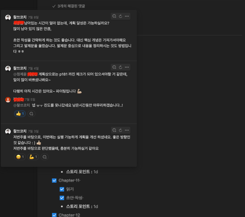 코치가 계속 스터디 참가자들의 진행상황을 확인하고 피드백을 줍니다. 덕분에 스터디 참가자 생존자 전원이 3주 동안 목표를 100% 달성하였습니다.