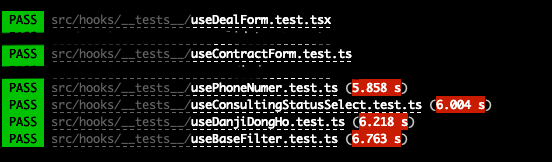 데이터 가공, 유효성 체크, 관련 API 페쳐, 이벤트 전송 등등의 비즈니스 로직들은 hooks에 응집시켜 놨습니다. 앞서 말씀드렸듯이 비즈니스 로직에 대해서만 테스트 코드를 달고자 했는데요. 이 hooks 들만 테스트 코드를 구축하고 통과시켰습니다.